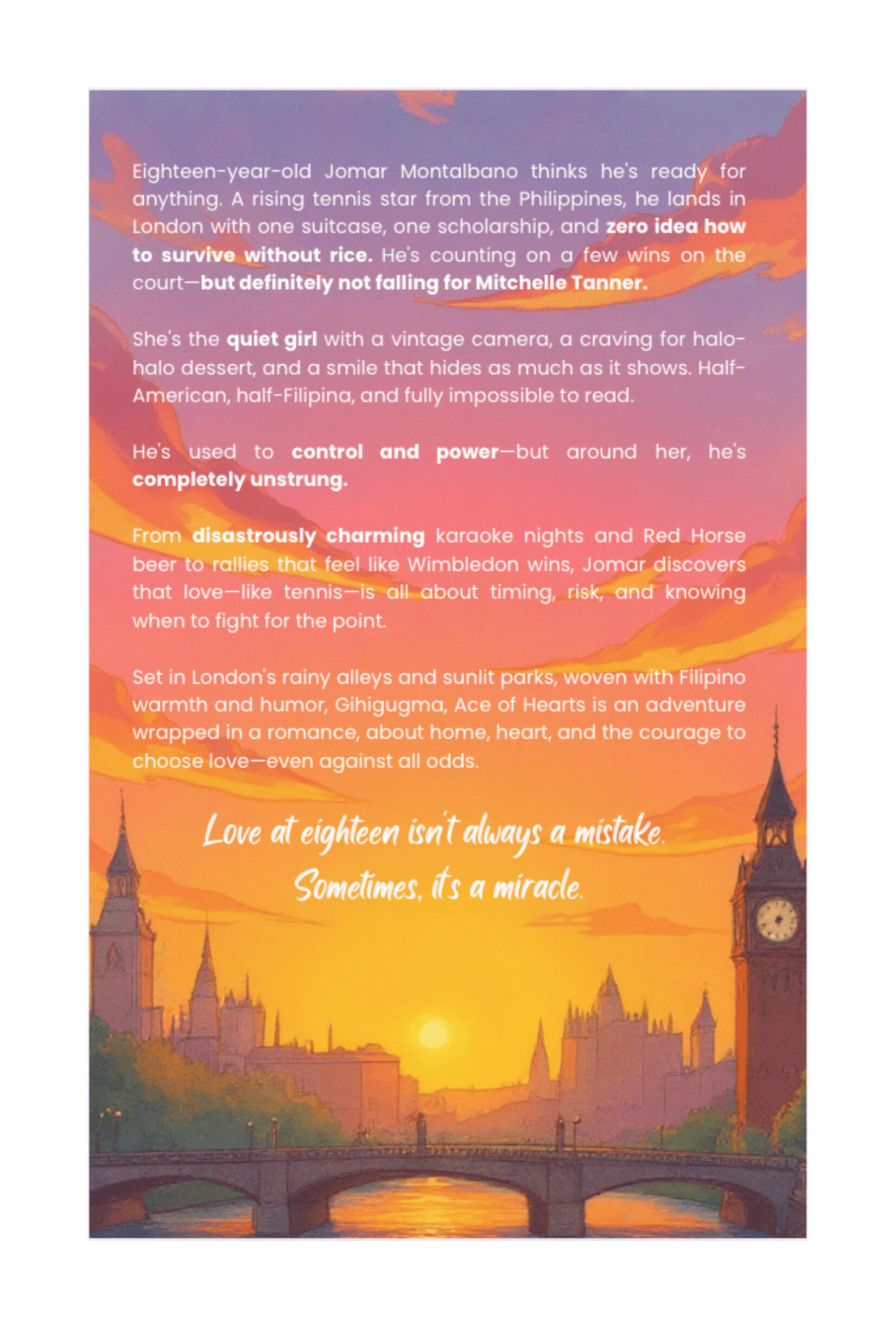 Eighteen-year-old Jomar Montalbano thinks he's ready for anything. A rising tennis star from the Philippines, he lands in London with one suitcase, one scholarship, and zero idea how to survive without rice. He's counting on a few wins on the court—but definitely not falling for Mitchelle Tanner.She's the quiet girl with a vintage camera, a craving for halo-halo, and a smile that hides as much as it shows. Half-American, half-Filipina, and fully impossible to read.He's used to power and control—but around her, he's completely unstrung.From vulnerable confessions in a darkroom's glow to rallies that feel like Wimbledon wins, Jomar discovers that love—like tennis—is all about timing, risk, and knowing when to fight for the point.Set in London's rainy alleys and sunlit parks, woven with island warmth and humor, Gihigugma, Ace of Hearts is an adventure about home, heart, and the courage to choose love against all odds.Love at 18 isn't always a mistake. Sometimes it's a miracle.